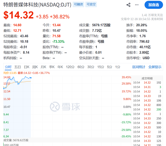 美国总统特朗普本人间接持有特朗普媒体超过1.14亿股。他在今年1月就职前,将这部分控股权益转入一个可撤销信托,且唯一受托人为其长子小唐纳德·特朗普。