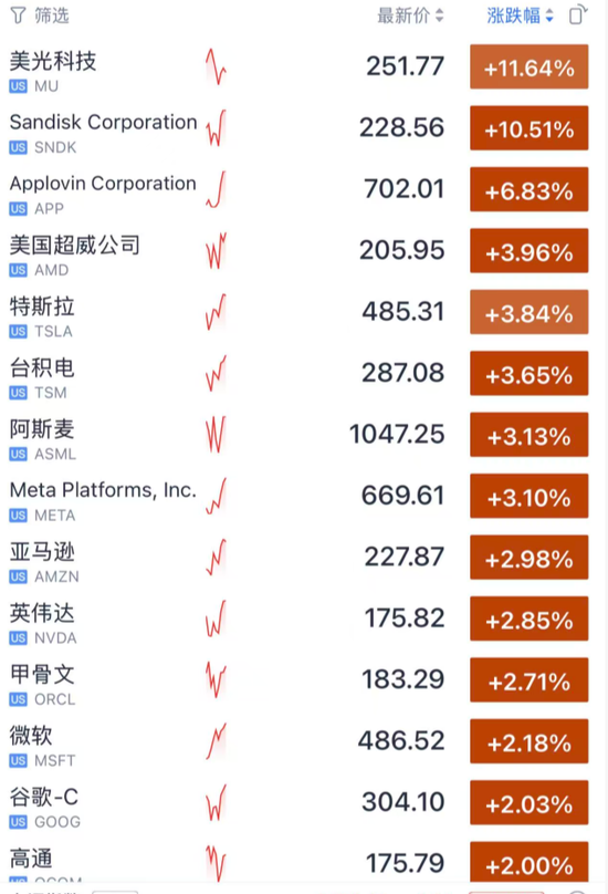 科技股集体暴涨,美光科技涨超10%带动AI交易热度回升,原因是美光给出了相对稳健的业绩展望。这家半导体制造商上调了关键产品的业绩预期,并给出了远超预期的营收指引。有分析师表示,人工智能热潮正在造成存储芯片短缺,这可能会推高电子产品价格。