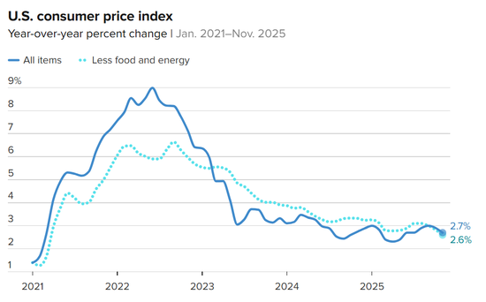 美国劳工统计局(BLS)公布的数据显示,剔除波动较大的食品和能源后的核心消费者价格指数(核心CPI)在11月同比上涨2.6%。两个月前该指标的同比涨幅为3%。整体CPI在11月同比上涨2.7%。